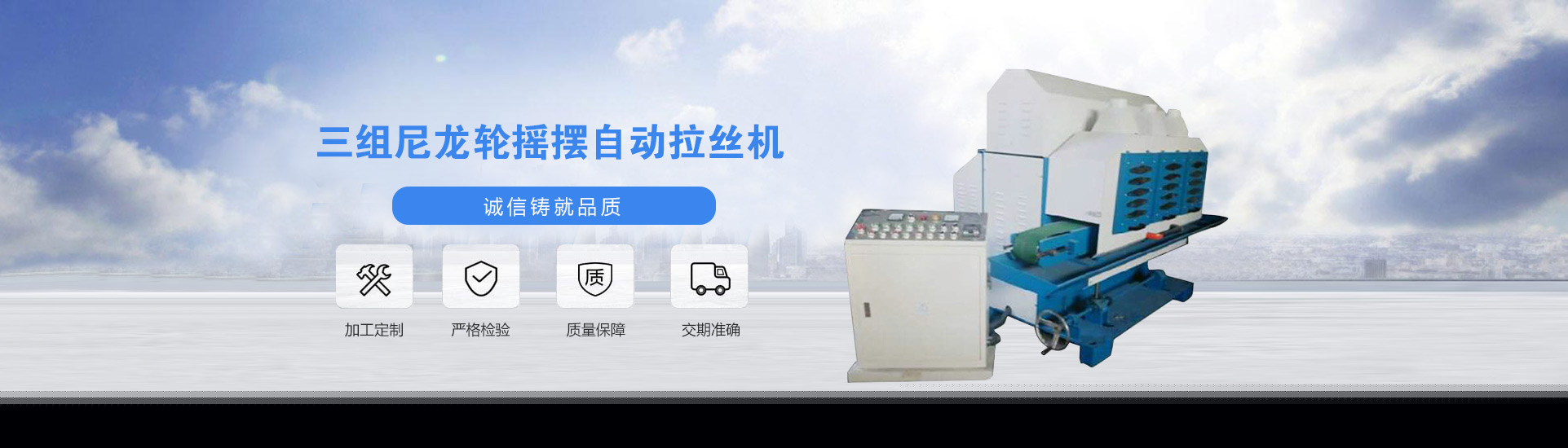 三組輸送式尼龍輪搖擺拉絲機由氣缸壓料,絲紋清晰明顯,汽缸壓料壓力均勻,可拉長直絲......